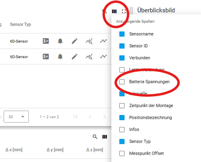 Ja, die Batteriespannung kann im Dashboard angezeigt werden. Klicken Sie dazu im Dashboard in der Sensorübersicht auf das Symbol mit den drei vertikalen Balken und aktivieren Sie in der Liste den Punkt „Battery voltages“. Der aktuelle Batteriewert in Volt wird daraufhin bei jedem Sensor eingeblendet.